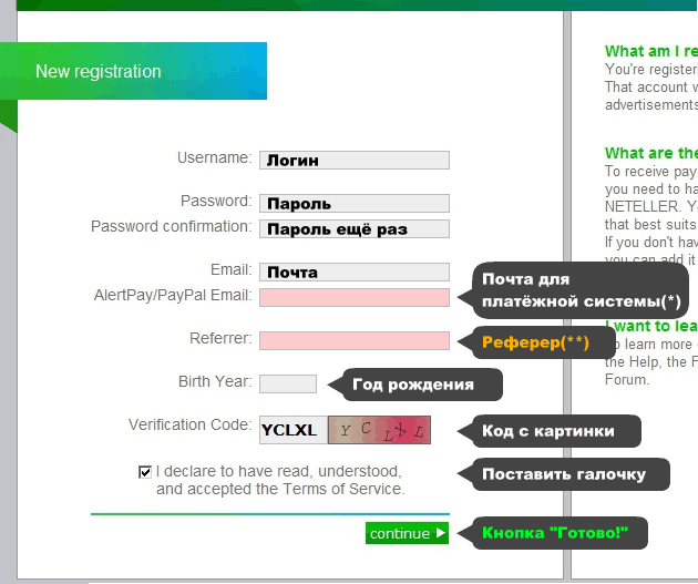Referrer:- если это поле у вас есть, впишите туда логин того, кто Вас пригласил, или оставьте пустым. Обычно это поле бывает только у тех, кто пришел не по реферальной ссылке.