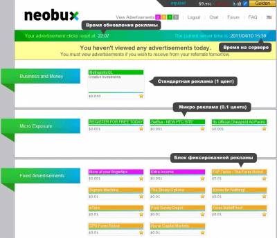 Для стандартного аккаунта вам будет гарантированно доступно 4 ссылки в день из блока Fixed Adverticements, но если часто заходить в аккаунт то можно поймать много микро-рекламы стоимостью 0.01 цента, иногда бывает мини-реклама за 0.05 цента и даже центовые ссылки. В самом низу находится блок устаревшей рекламы (Expired Advertisements) – для демонстрации активности рекламодателей.